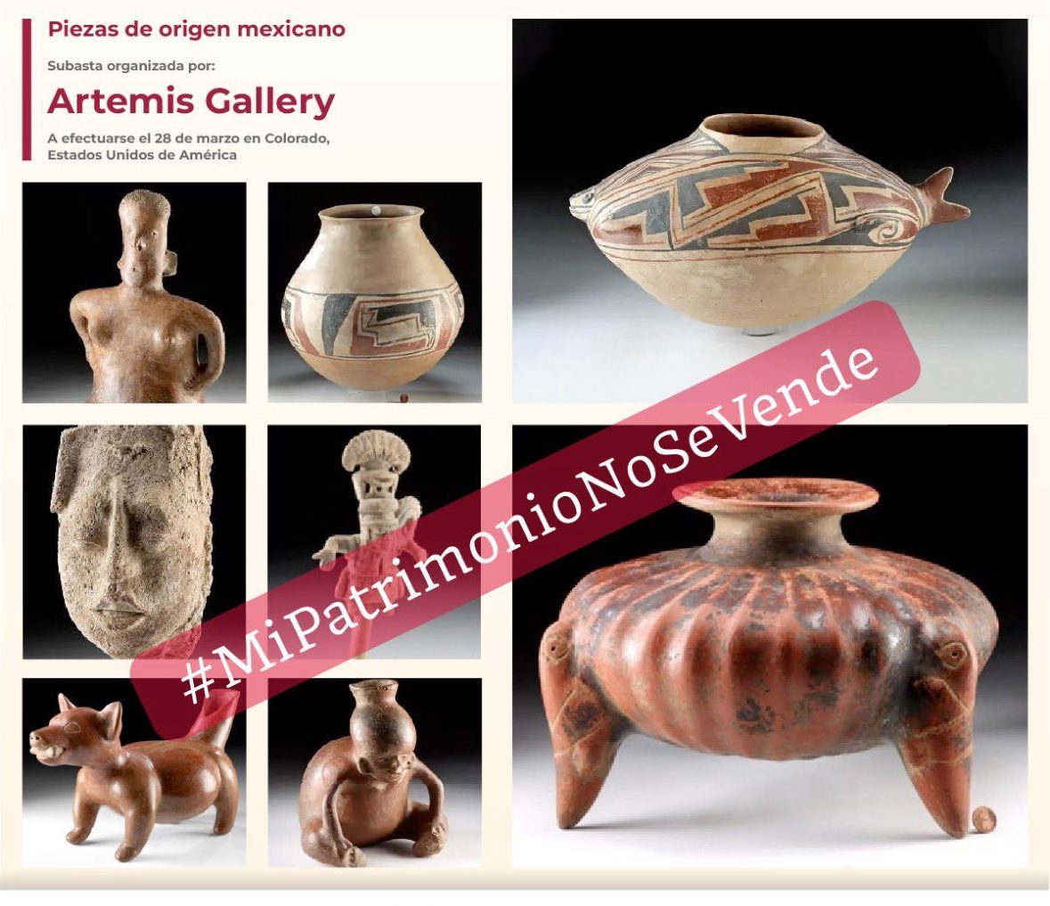 La Secretaría de Cultura federal y el Instituto Nacional de Antropología e Historia (INAH) manifiestan su rechazo a la subasta de bienes arqueológicos, patrimonio cultural de la nación mexicana, que Galería Artemis, de Louisville, Colorado, Estados Unidos, ha programado para el próximo 28 de marzo de 2024.