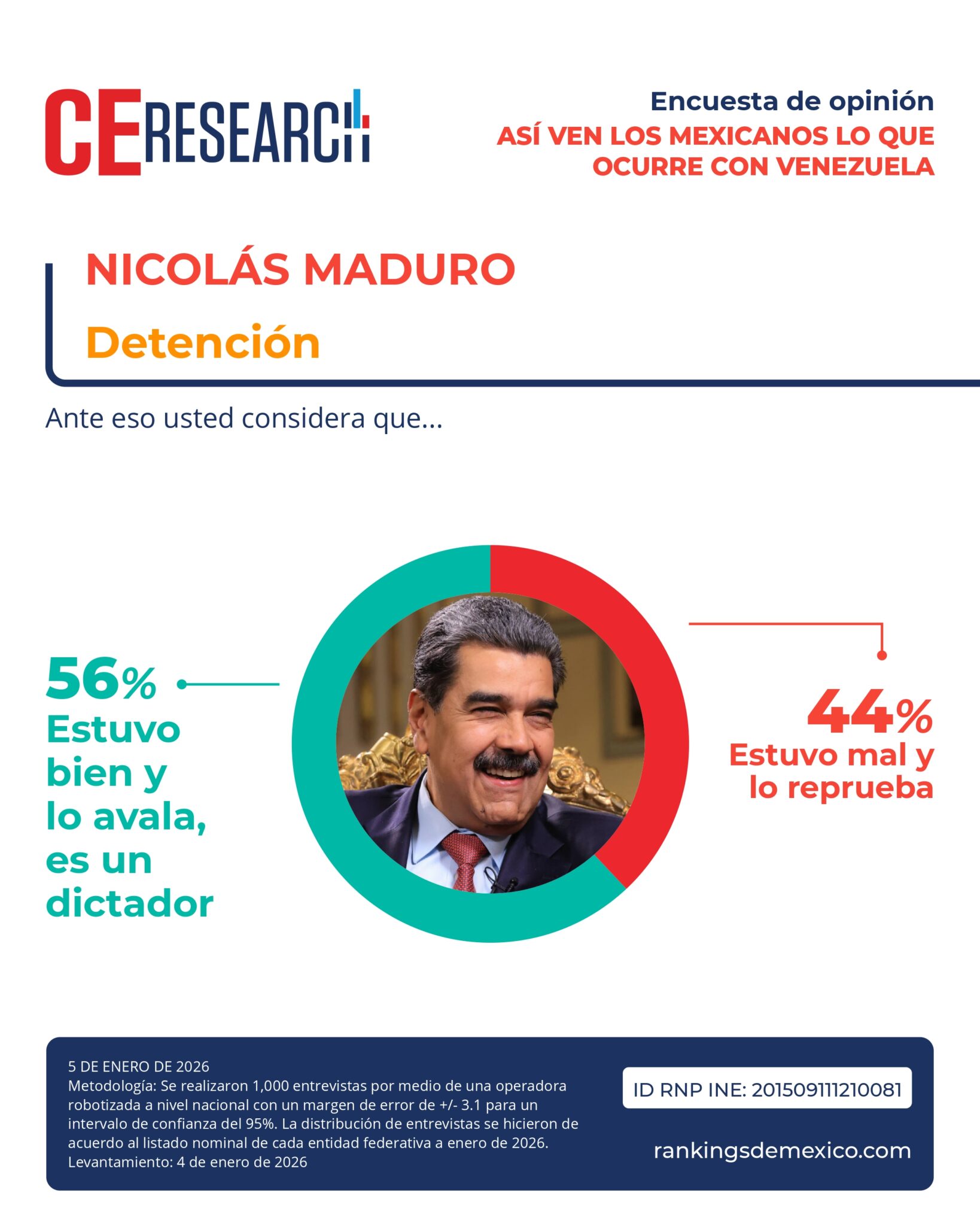 Una reciente encuesta nacional de CE Research, publicada este 5 de enero de 2026, revela una compleja radiografía de la opinión pública mexicana frente a la crisis política internacional que involucra a Nicolás Maduro, Donald Trump y el papel de los líderes mexicanos, Claudia Sheinbaum y Andrés Manuel López Obrador. Uno de los datos más destacados del estudio es el malestar que generó la intervención de Andrés Manuel López Obrador. Casi 7 de cada 10 mexicanos (70%) manifestaron su desagrado ante la reaparición del expresidente en la red social X, donde se pronunció en…