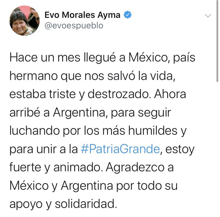 El expresidente de Bolivia, Evo Morales, quien llegó a Argentina como asilado político y refugiado, externó su “eterno agradecimiento” al presidente Andrés Manuel López Obrador, al pueblo y al gobierno de México por “salvarme la vida y por cobijarme”. En su cuenta de Twitter @evoespueblo, el exmandatario escribió: “Me sentí como en casa junto a las hermanas y hermanos mexicanos durante un mes”. Morales estuvo 30 días en México, país que le dio asilo político y refugio tras renunicar a la presidencia el pasado 10 de noviembre. En otro tuit…