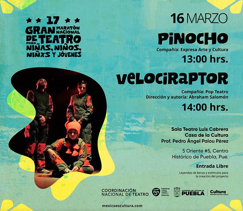Habrá dos funciones gratuitas el domingo 16 de marzo, a partir de las 13:00 horas. Como parte de la 17ª edición del “Gran Maratón Nacional de Teatro para Niñas, Niños y Jóvenes”, el Gobierno del Estado informa que se realizarán dos puestas en escena gratuitas, en la Casa de la Cultura “Profesor Pedro Ángel Palou Pérez”, ubicada en la 5 Oriente No. 5 del Centro Histórico. El domingo 16 de marzo, a las 13:00 horas, la compañía Expresa Arte y Cultura presentará la obra Pinocho; mientras que a las 14:00…