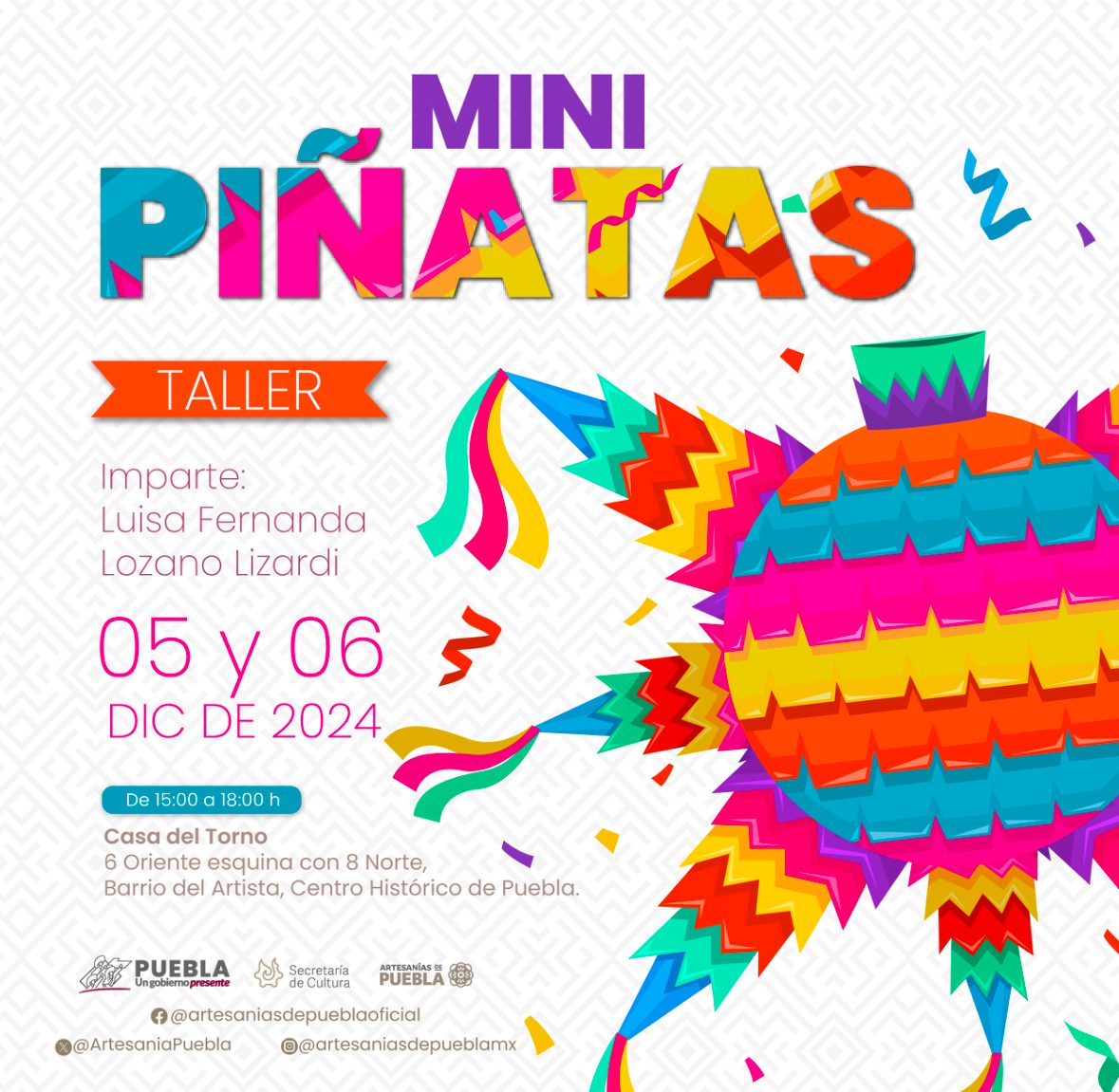 Como parte de las actividades decembrinas que desarrollará el gobierno presente de Sergio Salomón, la Secretaría de Cultura impartirá un taller de mini piñatas en la Casa del Torno, ubicada en la 6 Oriente esquina con 8 Norte, en el Barrio del Artista del Centro Histórico. La actividad estará dirigida al público en general y correrá a cargo de la diseñadora Luisa Fernanda Lozano Lizardi, quien dará a conocer a las y los asistentes el proceso y las técnicas de creación de piñatas tradicionales en pequeño formato, las cuales pueden…