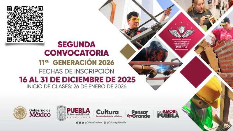 – Las y los interesados tendrán hasta el 31 de diciembre para registrarse, el inicio de clases será el 26 de enero de 2026. La Secretaría de Arte y Cultura del Estado de Puebla, a través de la Escuela Taller de Capacitación en Restauración, lanza por primera vez una segunda convocatoria de ingreso para las y los aspirantes a la 11ª Generación 2026, dirigida a jóvenes de entre 18 y 24 años interesados en la conservación del patrimonio cultural y en la formación especializada en oficios tradicionales. Este modelo educativo…