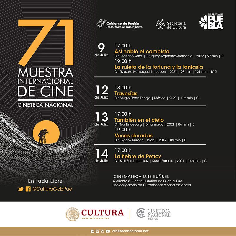 Del 05 al 09 y del 12 al 14 de julio, Puebla participará en la 71 Muestra Internacional de Cine, con la proyección de 13 películas en la Cinemateca Luis Buñuel, ubicada en la 5 Oriente número 5 colonia Centro, informa la Secretaría de Cultura. Esta edición integra tres largometrajes mexicanos, acompañados de proyecciones de países como Estados Unidos, Alemania, Rusia, Francia, Japón, Uruguay, Dinamarca, Israel y Ucrania, que forman una perspectiva amplia del séptimo arte del siglo XXI. Las películas son: «Nudo Mixteco» a las 18:00 horas el 05…