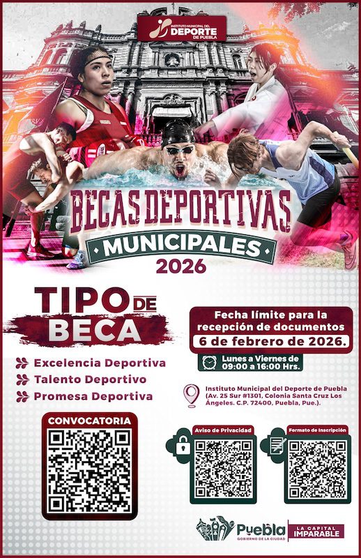 Se otorgarán en tres categorías: Excelencia Deportiva, Talento Deportivo y Promesa Deportiva Con el propósito de reforzar el esfuerzo deportivo y disciplina, el Gobierno de la Ciudad, encabezado por el alcalde Pepe Chedraui Budib, a través del Instituto Municipal del Deporte de Puebla (IMDP), dirigido por Ricardo Zayas Gallardo, anunció la convocatoria para las Becas Deportivas Municipales 2026, un programa que busca impulsar el talento poblano y fortalecer el deporte en la capital. El registro de aspirantes inicia este 6 de enero y permanecerá abierto hasta el 6 de febrero…