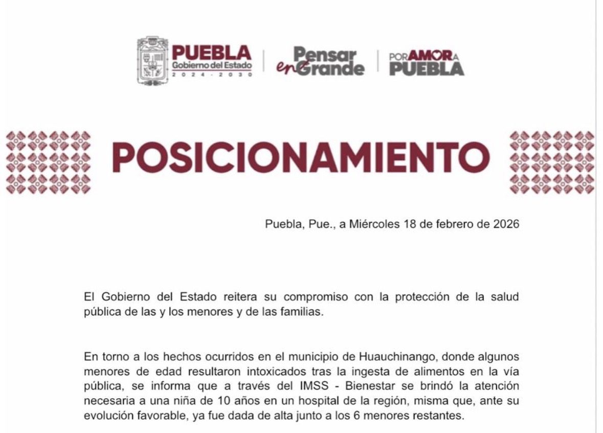 El Gobierno del Estado reitera su compromiso con la protección de la salud pública de las y los menores y de las familias. En torno a los hechos ocurridos en el municipio de Huauchinango, donde algunos menores de edad resultaron intoxicados tras la ingesta de alimentos en la vía pública, se informa que a través del IMSS – Bienestar se brindó la atención necesaria a una niña de 10 años en un hospital de la región, misma que, ante su evolución favorable, ya fue dada de alta junto a los…