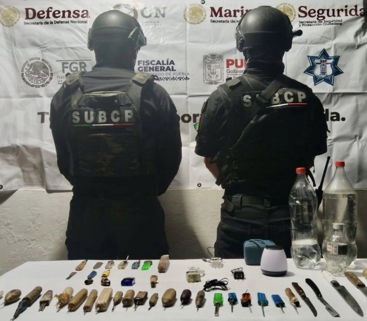 Al interior de estos centros penitenciarios se aseguraron 51 objetos punzocortantes, 45 envoltorios con posible marihuana, 18 teléfonos celulares y otros artículos prohibidos. Con el objetivo de mantener el orden, la gobernabilidad y el correcto funcionamiento en los centros penitenciarios del estado, la Secretaría de Seguridad Pública (SSP) efectuó operativos de revisión al interior de los penales de Puebla y Huauchinango. Con apoyo de la Secretaría de Marina (SEMAR), Secretaría de la Defensa Nacional (DEFENSA) y Guardia Nacional (GN), la SSP localizó en el centro penitenciario de Puebla 45 envoltorios…