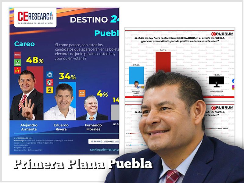Por Ricardo Morales Ayer, dos empresas de prestigio, Campaing&Eleccion y Rubrum, dieron a conocer los resultados de diferentes estudios de opinión, los dos ponen como puntero al candidato de la alianza “Sigamos haciendo historia”, Alejandro Armenta Mier. Campaing&Eleccion le da una ventaja de 14 puntos a Armenta por encima de su adversario, el candidato de “Corrijamos el Rumbo de Puebla”, Eduardo Rivera Pérez, una vez terminado el periodo de precampaña. De acuerdo a la primera encuestadora Campaing, Armenta tiene, al momento, 48 por ciento de preferencia, por el 34 por…