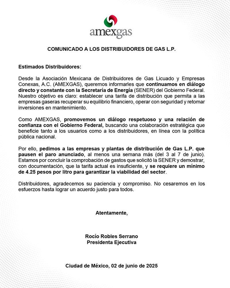 Alma Méndez La Asociación Mexicana de Distribuidores de Gas Licuado y Empresas Conexas (Amexgas) solicitó a las empresas distribuidoras de gas LP postergar al menos una semana el paro nacional que se había anunciado para estos días. El paro fue inicialmente convocado por Distribuidores de Gas LP el pasado 17 de mayo, en demanda de un ajuste de 4.25 pesos al precio por litro del energético. Los distribuidores argumentan que el tope de precios establecido por el gobierno desde 2021 ha afectado gravemente la viabilidad financiera del sector, provocando despidos…