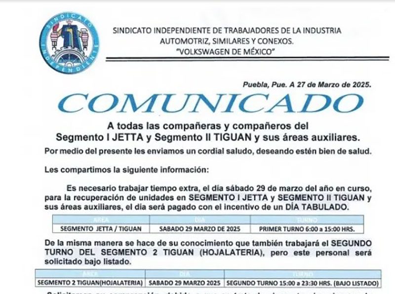 Alma Méndez El Sindicato Independiente de Trabajadores de la Industria Automotriz Volkswagen (SITIAVW) informó que trabajadores de los segmentos de producción de los modelos Taos, Jetta y Tiguan laborarán tiempo extra el sábado 29 de marzo con el objetivo de recuperar producción. De acuerdo con el sindicato, los horarios de trabajo serán los siguientes: Segmento III de Taos: Primer turno: 6:00 a 15:00 horas. Segundo turno: 15:00 a 23:30 horas. Segmento de Jetta y Tiguan: Primer turno: 6:00 a 15:00 horas. Segmento II de Tiguan (área de hojalatería): Segundo turno:…