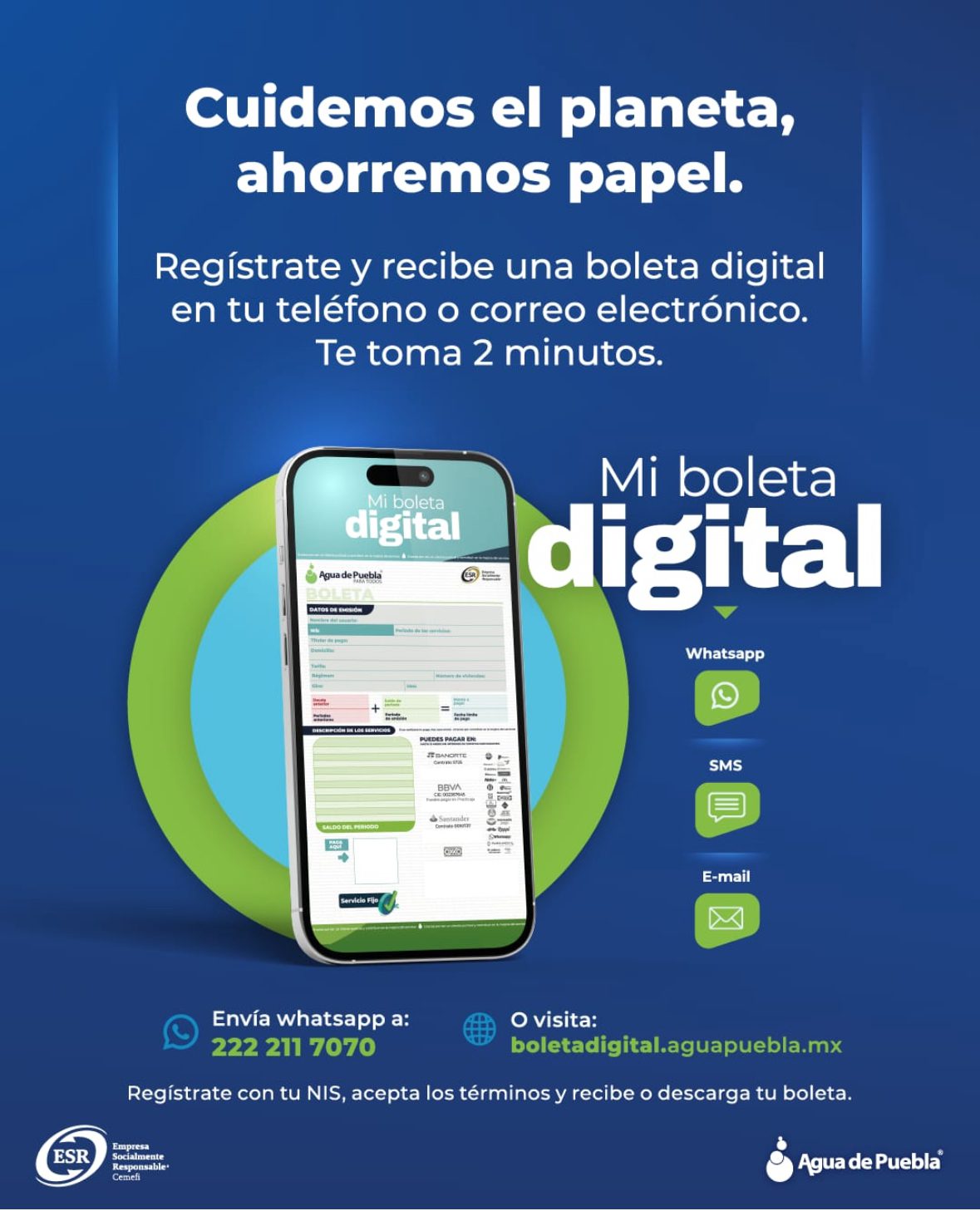 Con el firme compromiso de modernizar la atención a las y los usuarios y avanzar hacia un servicio más sostenible, Agua de Puebla implementó la Boleta Digital, una alternativa ecológica, ágil y completamente segura que ya beneficia a más de 15 mil personas.