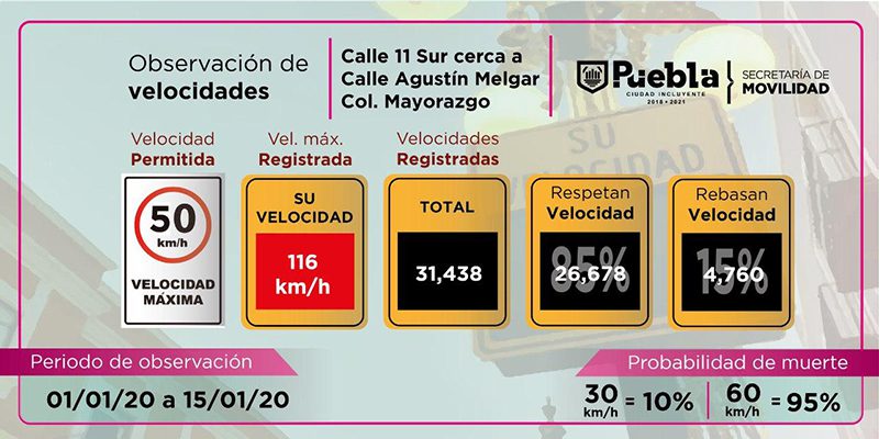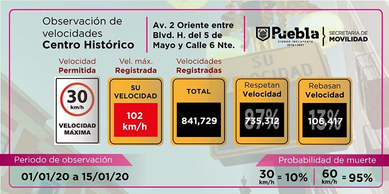 Con el objetivo de hacer conciencia entre las y los usuarios de automóvil sobre los límites de velocidad, para reducir el número de incidentes de tránsito en las 15 intersecciones más peligrosas y consolidar la zona 30 del Centro Histórico, el Gobierno de la Ciudad de Puebla, a través de la Secretaría de Movilidad, colocó 28 monitores de velocidad, los cuales empezaron a funcionar en su totalidad el 29 de diciembre de 2019.