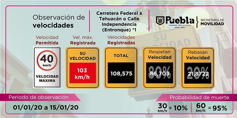 o En la Carretera Federal a Tehuacán o calle independencia (entronque) se registraron velocidades máximas de 103km/h, siendo la permitida 40km/hr.