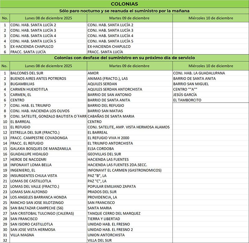 El paro de la planta desfasará el servicio de agua en 37 colonias el lunes 8 de diciembre, en 38 colonias el martes 9 y el miércoles 10 de diciembre sólo en 6 colonias