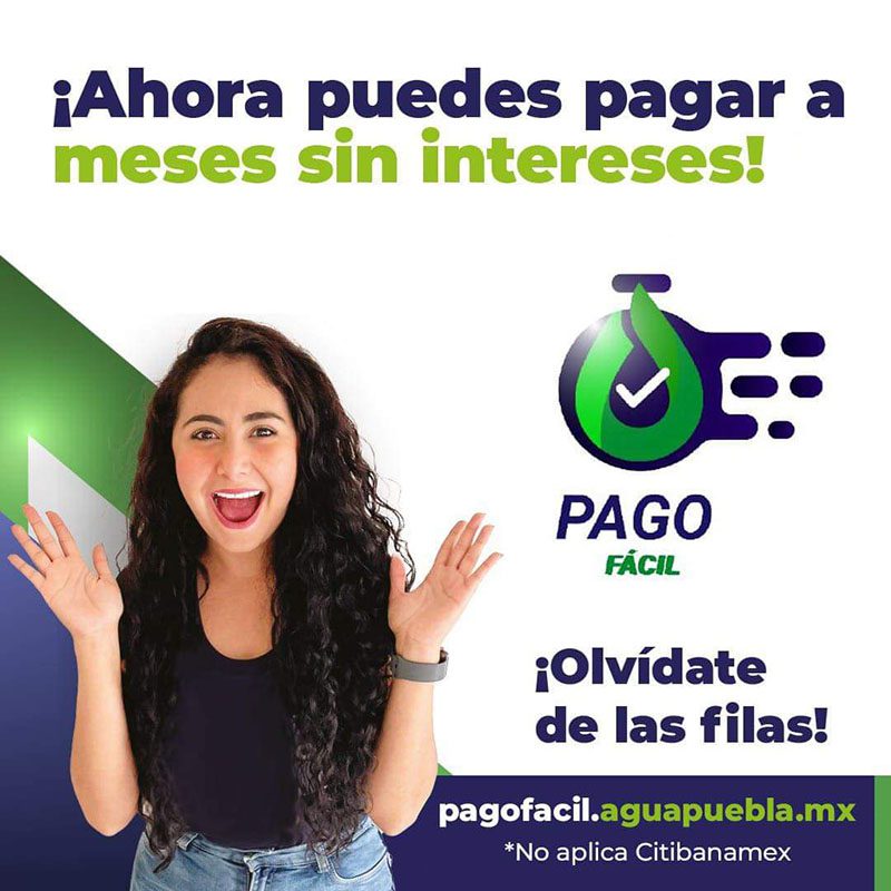 Agua de Puebla para Todos ofrece ahora a los usuarios la nueva opción para pagar sus adeudos de los servicios de agua, drenaje y saneamiento, a meses sin intereses y con tarjetas de crédito participantes, a través de la plataforma en línea Pago Fácil.