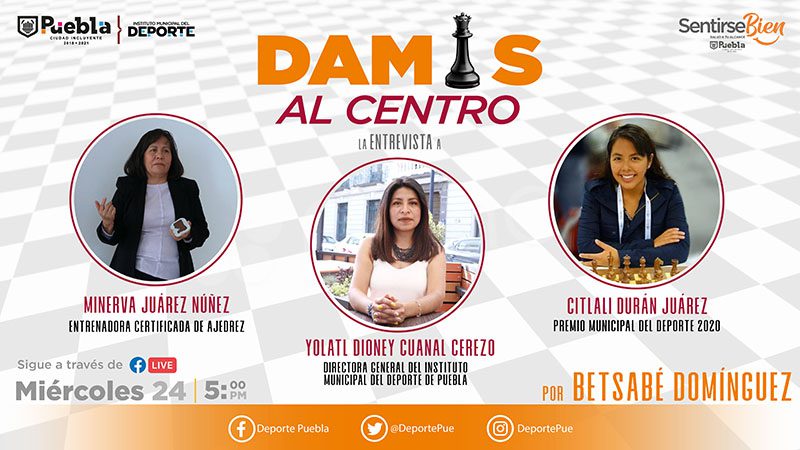 El Ayuntamiento de Puebla, a través del Instituto Municipal del Deporte, realizará una entrevista que tendrá como tema principal al deporte-ciencia el día miércoles 24 de marzo a partir de las 17:00 horas, mediante el Facebook Live de Deporte Puebla. Citlali Durán Juárez y Minerva Juárez Núñez, acompañadas por la directora general del Instituto Municipal del Deporte, Yolatl Dioney Cuanal Cerezo, hablarán sobre sus experiencias más allá de los límites del tablero de ajedrez.