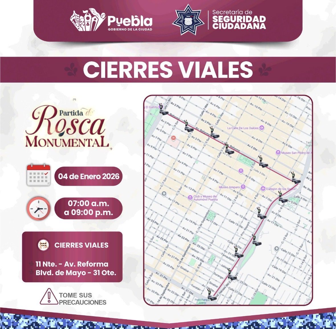 En el marco de las acciones para el desarrollo y la instalación y partida de la Rosca de Reyes Monumental que organiza el DIF Puebla Capital, el Gobierno de la Ciudad que encabeza el presidente municipal Pepe Chedraui Budib, a través de la Secretaría de Seguridad Ciudadana (SSC), implementará un dispositivo de vialidad en el primer cuadro del Centro Histórico.