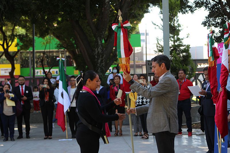 Fue en la explanada del Parque Juárez donde se llevó a cabo la entrega de 35 lábaros patrios, beneficiando a 27 escuelas, cinco juntas auxiliares, dos inspectorías y un comisariado ejidal.