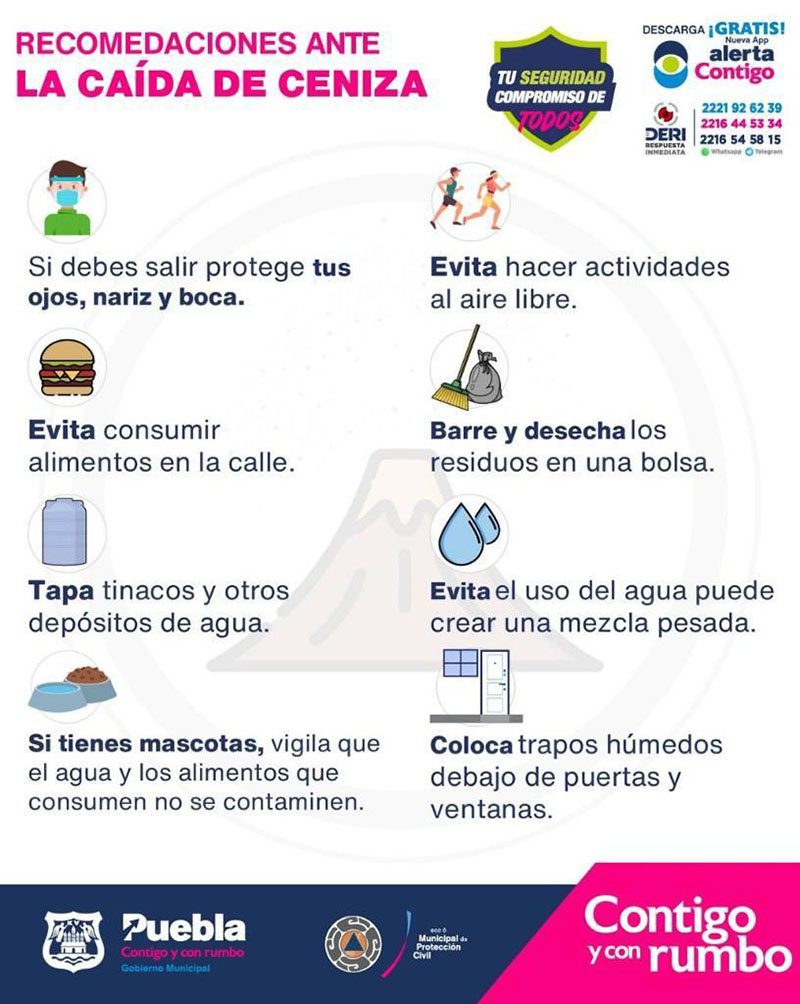 Ante la constante caída de ceniza volcánica, el Ayuntamiento de Puebla -que preside Eduardo Rivera Pérez- emite recomendaciones de Protección Civil para prevenir afectaciones a la salud: