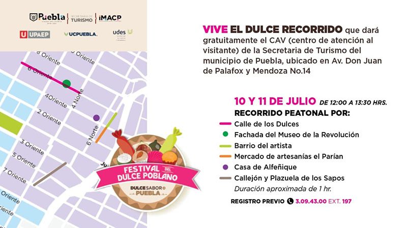 También, de 12:00 a 13:30 horas, sábado y domingo, se llevará a cabo un “Dulce recorrido” por la Calle de los Dulces, Fachada del Museo de la Revolución, Barrio del artista, Mercado de artesanías “El Parián”, Casa del Alfeñique y el Callejón y Plazuela de los Sapos para disfrutar de esta muestra gastronómica. Para más información o apartar su lugar, llamar al número telefónico (222) 309 4300, extensión 197.