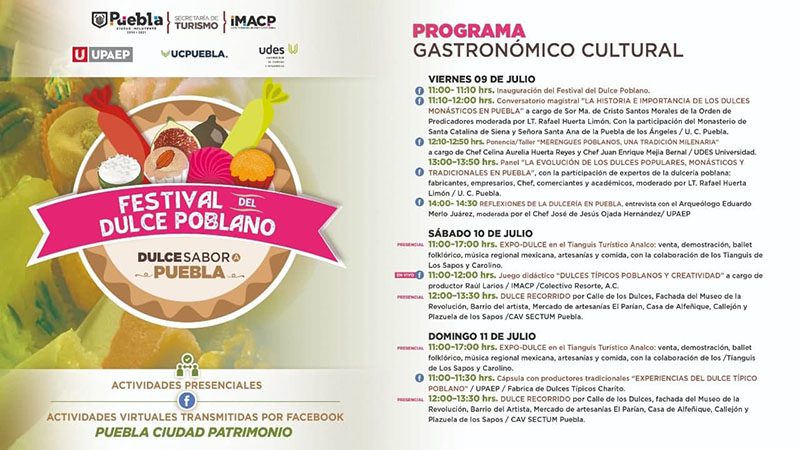Así mismo, el Colectivo Resorte A.C. realizará en línea el sábado 10 de julio, a las 11:00 horas, la actividad didáctica “Dulces típicos poblanos y creatividad”. El domingo 11, a la misma hora, se compartirá la cápsula de video con productores tradicionales “Experiencias del dulce típico poblano”, a cargo de la UPAEP y la Fábrica de Dulces Típicos Charito.