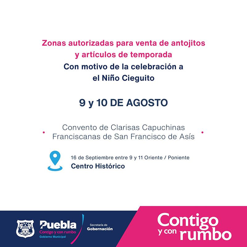 Con motivo de la celebración popular al “Niño Cieguito” se informa que el Ayuntamiento de Puebla permitirá la presencia de comercio itinerante en la calle 16 de Septiembre, del 9 al 10 agosto, únicamente para la venta de antojitos y artículos religiosos.