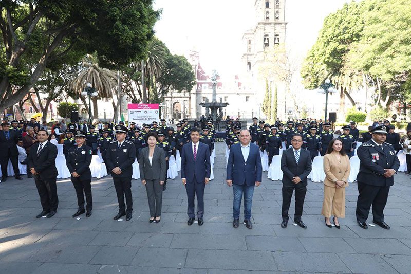 Con el objetivo de incentivar y fomentar el crecimiento y desarrollo laboral en el Servicio Profesional de Carrera, Eduardo Rivera Pérez, presidente municipal, realizó la Promoción de Grado a 39 elementos municipales: 37 Policías Terceros y dos Policías Segundos, de la convocatoria 2022, esto como un reconocimiento por su buen desempeño y trayectoria en la Secretaría de Seguridad Ciudadana.