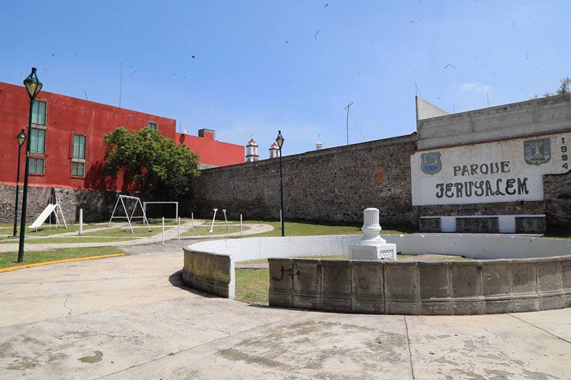 Por parte de esta dependencia, se aplicaron repellados y pintura vinílica en muros históricos de la fachada del Parque Jerusalem; consolidaron y dio mantenimiento a los contrafuertes de la fachada histórica; se rehabilitó, limpió y pintó el mobiliario urbano, así como el piso de los pasillos, guarniciones, cara interna de la cantería de la fuente y postes.