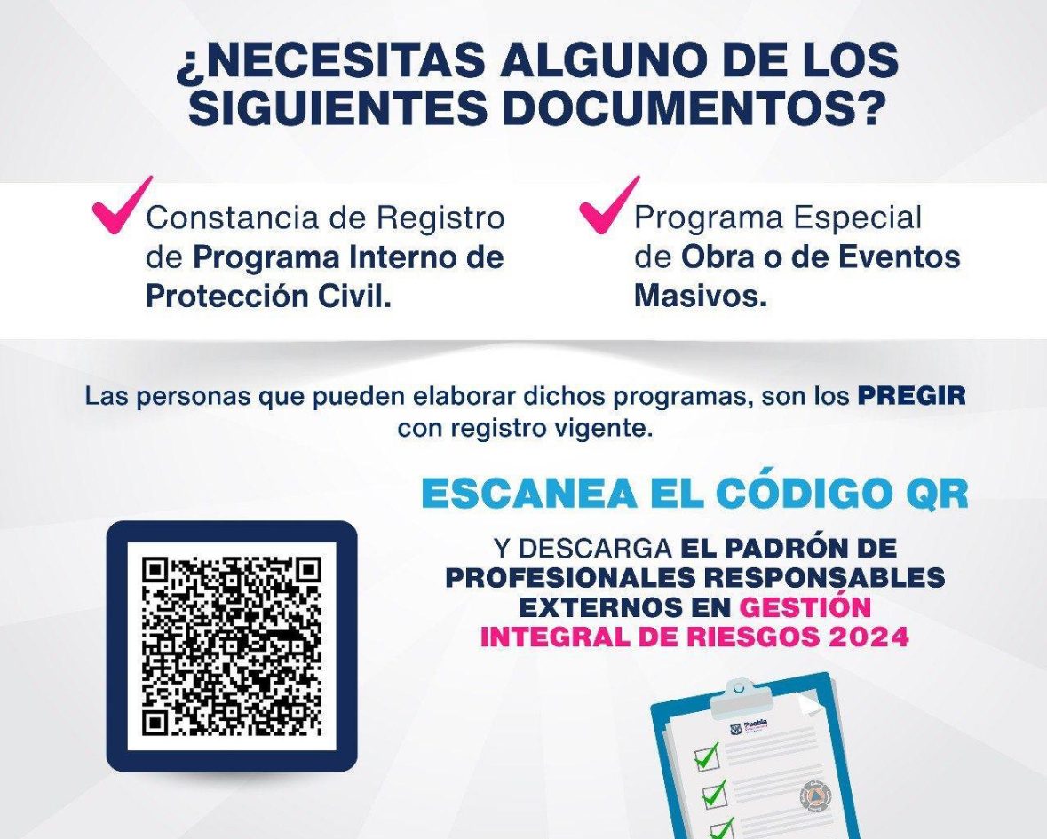 El Ayuntamiento de Puebla – que preside Adán Domínguez Sánchez – a través de la Secretaría de Gestión y Desarrollo Urbano, invita a las y los poblanos a consultar el padrón de Profesionales Responsables Externos en Gestión de Riesgos (PREGIR), con el objetivo de solicitar el apoyo de personas acreditadas al realizar un trámite en materia de Protección Civil.