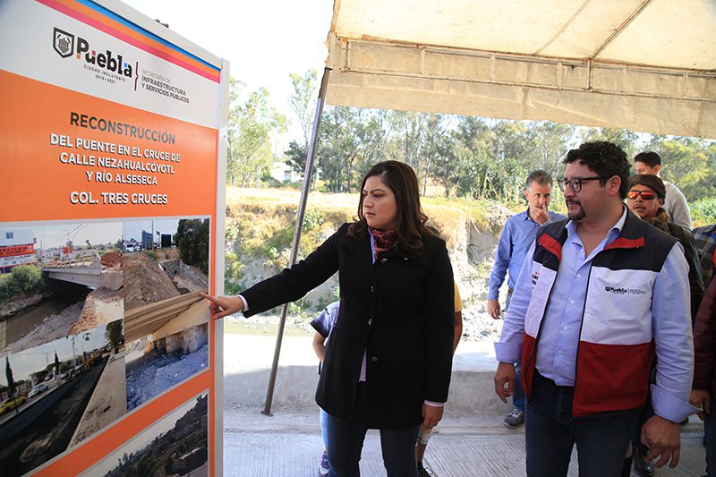 Como parte de las acciones para mejorar la calidad de vida de las y los habitantes de Puebla, el Gobierno de la Ciudad, encabezado por Claudia Rivera Vivanco, realiza la entrega de la reconstrucción del puente ubicado en el cruce de la calle Netzahualcóyotl y Río Alseseca.