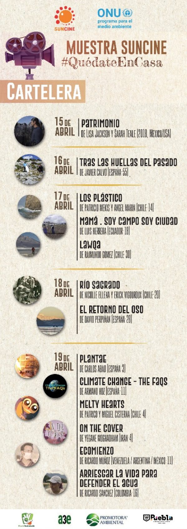 Se compartirán los enlaces de la muestra de SUNCINE en las redes sociales del Ayuntamiento, mediante la participación de ONU Medio Ambiente México, el Municipio de Puebla y de Promotora Ambiental S.A. de C.V. (PASA), las cintas serán proyectados del 15 al 19 de abril de 2020 en la liga: www.suncinefest.com/es/mexico.