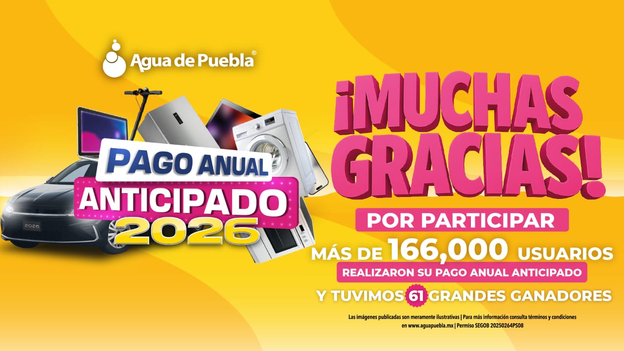 Como muestra de agradecimiento a la lealtad y confianza de más de 166 mil usuarios que realizaron su Pago Anual Anticipado desde octubre 2025 a marzo 2026, Agua de Puebla realizará este lunes 6 de marzo la segunda rifa de 60 grandes premios.