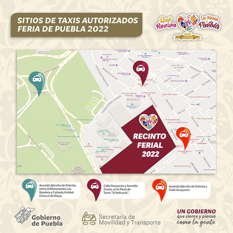 Para promover un transporte seguro durante las actividades recreativas y culturales, todas las unidades pueden identificarse mediante un distintivo de la Feria de Puebla 2022, que incluye un folio de taxi o transporte público para que la población esté segura de que el vehículo abordado cuenta con los documentos necesarios vigentes, póliza de seguro y está regulado por la SMT.