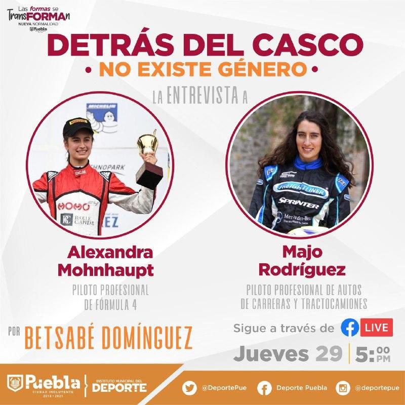 El Gobierno de la Ciudad de Puebla, a través del Instituto Municipal del Deporte (IMDP), compartirá con la ciudadanía la trayectoria de dos mujeres que han destacado en el mundo de las carreras, María José Rodríguez Gaña, piloto de autos y tractocamiones, así como Alexandra Mohnhaupt, piloto profesional de Fórmula 4, el jueves 29 de octubre a las 17:00 horas.