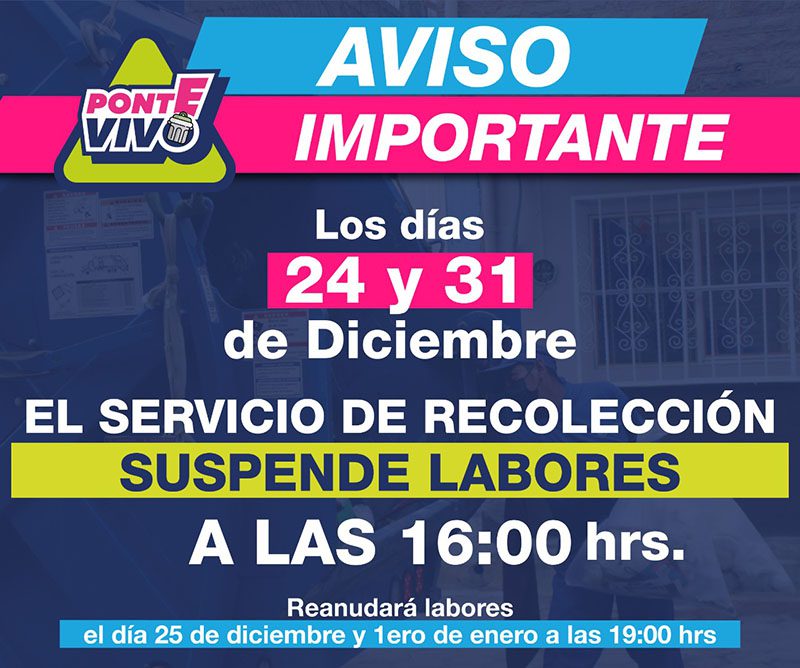 Derivado de las festividades de Navidad y Fin de Año, el Ayuntamiento de Puebla informa que el servicio de recolección domiciliaria de residuos sólidos urbanos en el municipio de Puebla suspenderá labores a partir de las 16:00 horas los días 24 y 31 de diciembre de 2022.
