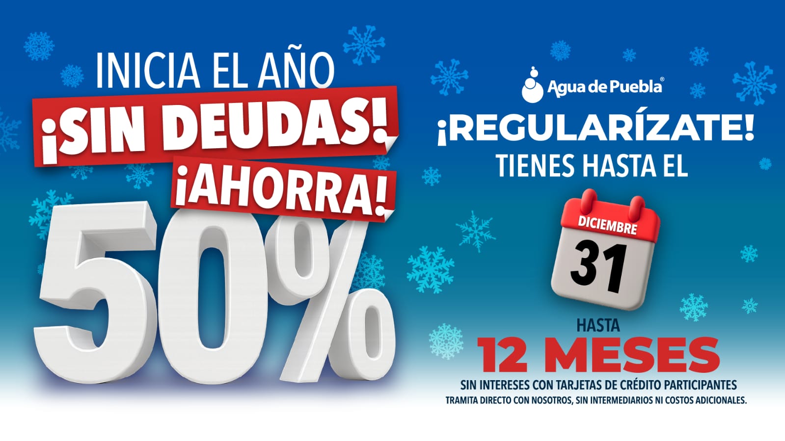 Puebla, Pue., a 07 de diciembre de 2025. – Agua de Puebla informa a todos los usuarios que cuentan con adeudos en los servicios de agua potable, drenaje y saneamiento, que el próximo 31 de diciembre de 2025 será el último día para ponerse al corriente con un 50% de ahorro en su deuda, deban lo que deban sin importar el monto, a través del programa Regularízate.