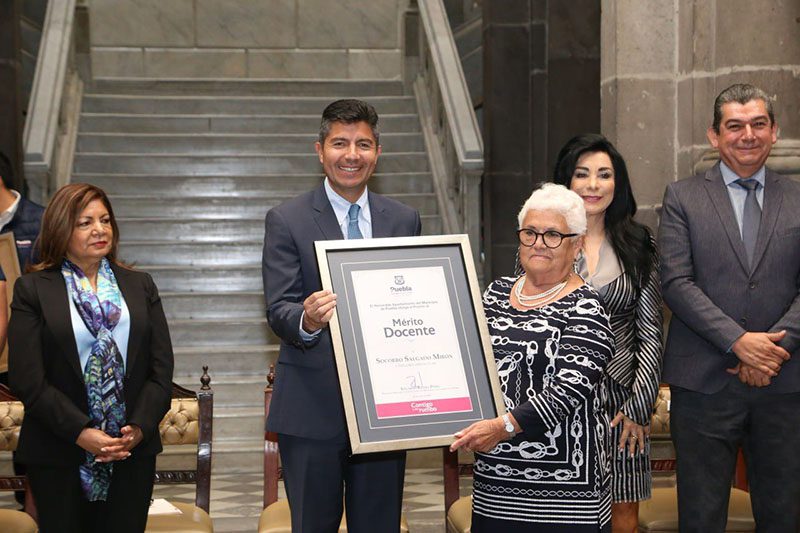 Siete profesores con destacada trayectoria en diversos niveles educativos recibieron de Eduardo Rivera Pérez, presidente municipal, el “Premio al Mérito Docente”, distinción especial que otorgó el Ayuntamiento de Puebla en conmemoración del Día del Maestro y la Maestra.