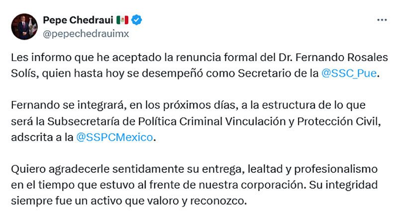 El alcalde José Chedraui aceptó la renuncia formal de Fernando Rosales Solís, quien hasta hoy se desempeñó como titular de la Secretaría de Seguridad Ciudadana.