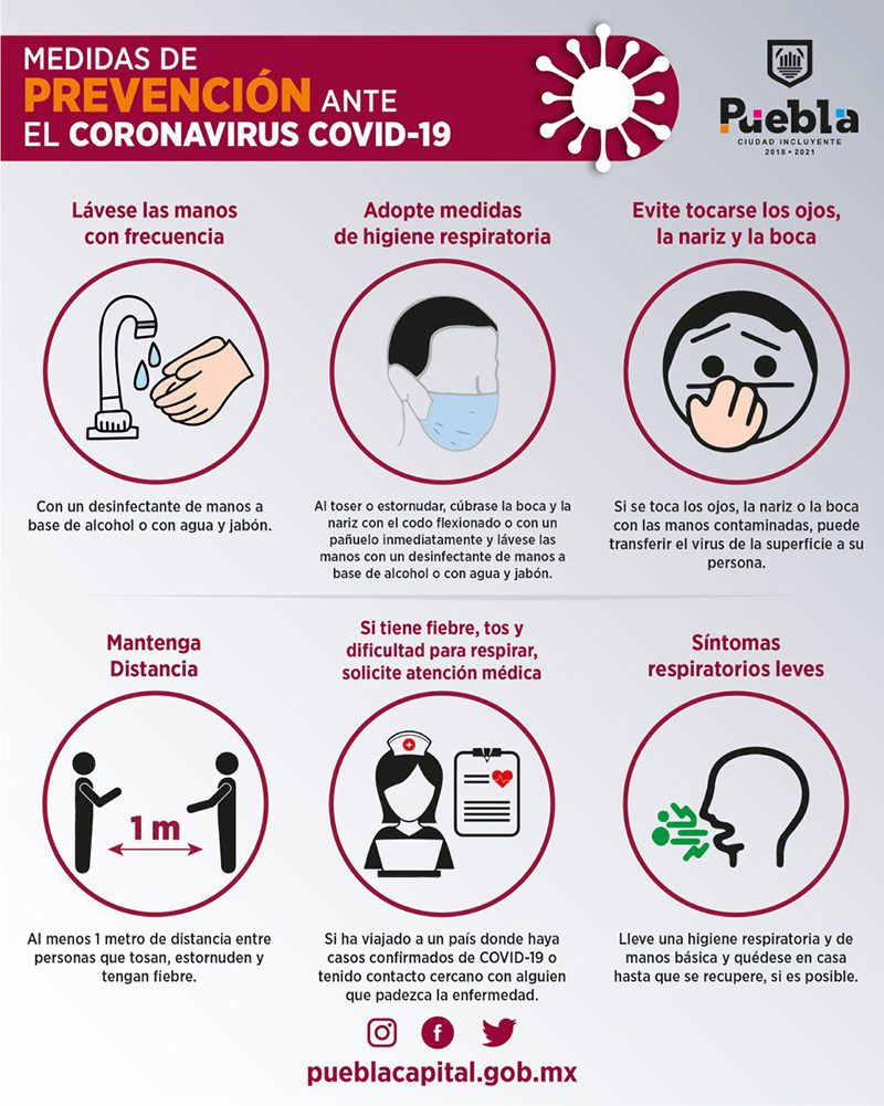 Ante la llegada del coronavirus a México, el Gobierno de la Ciudad de Puebla hace un llamado a la ciudadanía a adoptar las recomendaciones preventivas que ha emitido la Secretaría de Salud para hacer frente a esta eventualidad y evitar así, cualquier riesgo de contagio.