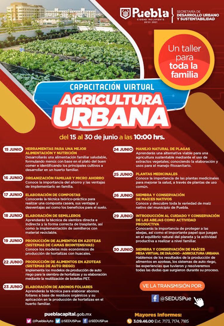 A partir de las 10:00 horas, iniciando este lunes 15 de junio y hasta el martes 30 de junio de 2020, se transmitirán en vivo, desde la cuenta de Facebook @SEDUSPue, 12 cursos virtuales de agricultura urbana que ayudarán a las personas a conectar con la naturaleza y conocer los ciclos naturales de la mayoría de alimentos que se consumen, todo desde la sana convivencia familiar.