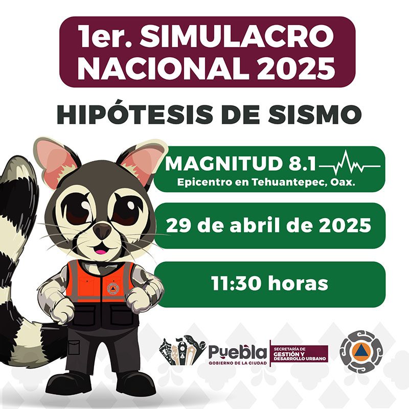 Como parte de la estrategia para salvaguardar la vida de las y los poblanos, el Gobierno de la Ciudad encabezado por el presidente municipal, Pepe Chedraui Budib, hace un llamado a la ciudadanía a prepararse adecuadamente para el Primer Simulacro Nacional 2025, que se llevará a cabo el próximo 29 de abril a las 11:30 horas.