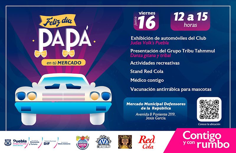 El Ayuntamiento de Puebla, a través de la Dirección de Mercados de la Secretaría de Economía y Turismo, invita a las y los poblanos a celebrar el Día del Padre este 18 de junio en el Mercado Municipal Defensores de la República, ubicado en 8 Poniente 2119, donde habrá diversas actividades de 12:00 a 15:00 horas.