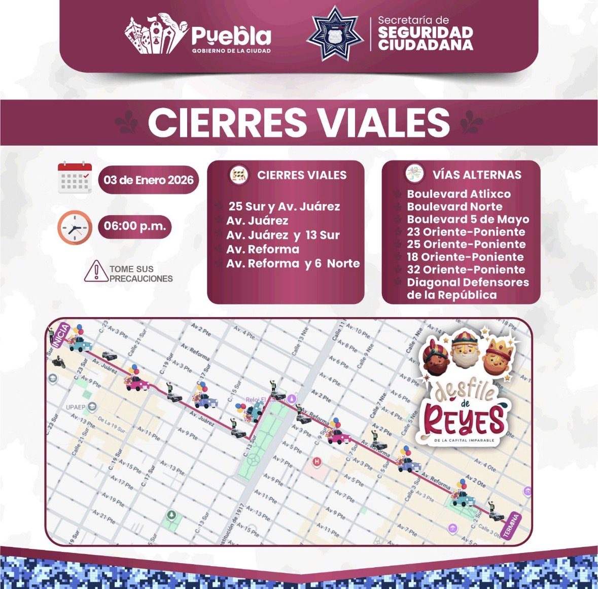 La Secretaría de Seguridad Ciudadana (SSC) informa que la Dirección General de Control de Tránsito, realizará cierres totales y parciales a la circulación a partir de las 16:00 horas del sábado 03 de enero hasta las 19:00 horas del mismo día, derivado del Desfile de Reyes de la Capital Imparable.