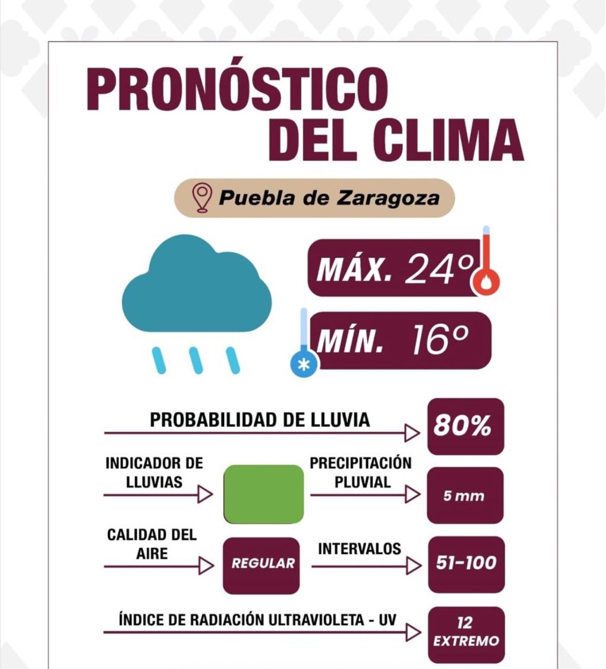 El Gobierno de la Ciudad de Puebla informa que se prevé un cielo parcialmente nublado durante el día, con alta probabilidad de lluvias ligeras a moderadas por la tarde, con acumulaciones estimadas entre 0 a 5 mm. La temperatura máxima será de 24°C y la mínima de 16°C. Se recomienda a la población tomar previsiones al salir y considerar posibles encharcamientos en zonas de riesgo.