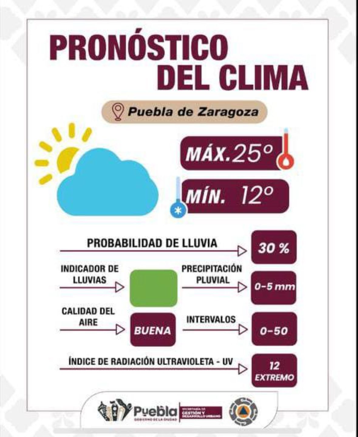 Durante esta jornada, la ciudad de Puebla presentará condiciones mayormente nubladas, con una temperatura máxima estimada de 25°C y mínima de 12°C.