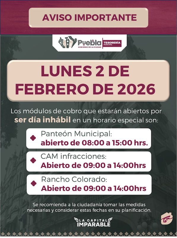 El Gobierno de la Ciudad, a través de la Tesorería Municipal, informa a la ciudadanía los módulos de cobro que estarán abiertos en un horario especial este lunes 02 de febrero, por ser día inhábil.