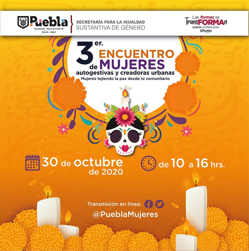 Debido a las condiciones actuales de la emergencia sanitaria provocada por COVID-19, este tercer encuentro, al igual que su edición pasada, se realizará totalmente de manera digital a través de Facebook Live https://www.facebook.com/PueblaMujeres hasta las 16:00 horas.