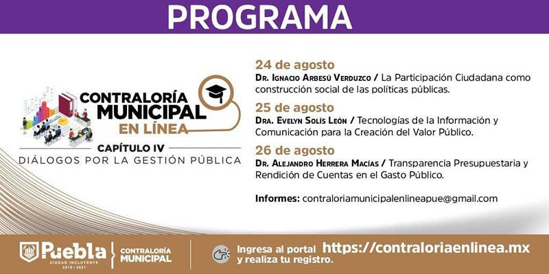 El Ayuntamiento de Puebla invita a todas y todos los interesados a participar en el capítulo IV de la Contraloría Municipal en Línea, Diálogos por la gestión pública, el último capítulo de esta serie de seminarios virtuales contará con expertos en las materias de gestión pública, gobierno abierto y transparencia presupuestaria.
