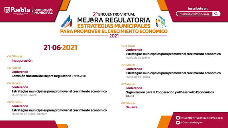 Desde el segundo Encuentro Virtual de Mejora Regulatoria denominado “Estrategias Municipales para Promover el Crecimiento Económico 2021”, el Ayuntamiento de Puebla compartirá experiencias locales para promover el crecimiento económico durante el periodo de contingencia sanitaria derivado del COVID-19.