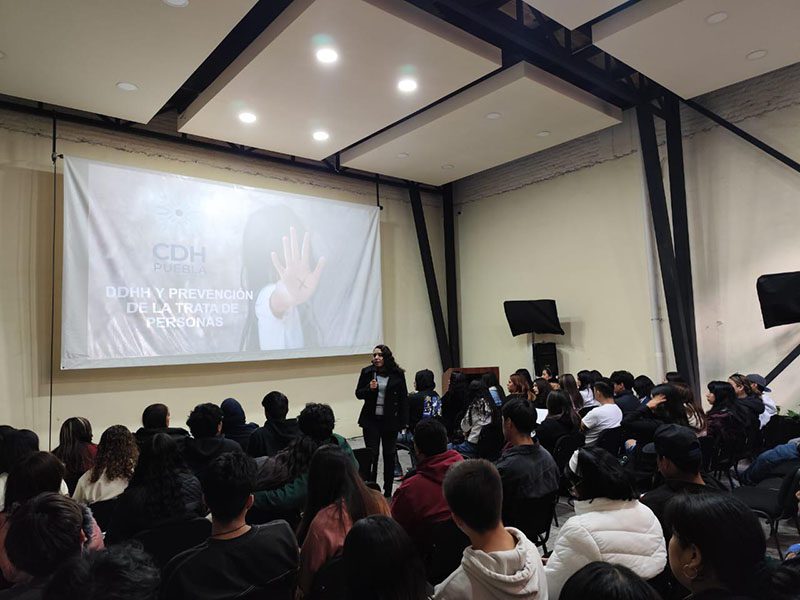 Con el objetivo de sensibilizar y fortalecer el conocimiento en temas fundamentales para la protección de los derechos humanos, personal de la Comisión de Derechos Humanos del Estado de Puebla, encabezada por su presidenta, Isela Sánchez Soya, impartió la capacitación titulada «Derechos Humanos y Prevención de la Trata de Personas» a estudiantes de la Licenciatura en Derecho de la Universidad IEU.