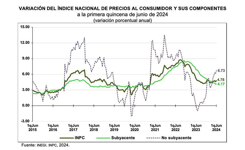 Por lo que los productos y servicios que más subieron su costo en los primeros quince días de junio fueron el chayote 79.25 por ciento, naranja 19.29 por ciento, lechuga 15.37 por ciento, plátanos 11.20 por ciento, el aguacate 7.70 por ciento, y los servicios turísticos de paquete subieron 3.76 por ciento.
